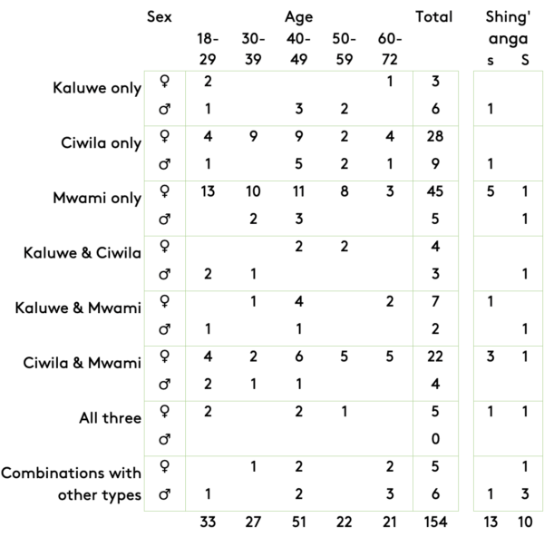 Possession type: Mwami and Ciwila were more frequently found than Kaluwe possession. Taking together the frequencies of each type alone and of its combinations with other types, we come to an approximate ratio of 6:5:2 for Mwami:Ciwila:Kaluwe in the 1980s. The other types are Moba (8), Bayambo (2) and Imfunguni (1).