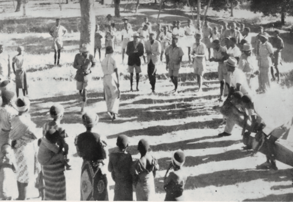 The caption says: “The end of the men’s part of Muloboko. The left hand man and most of his followers have regained their places. The last two are rounding the loop and will then dance to places. The women – and the men who have finished – are clapping.”
